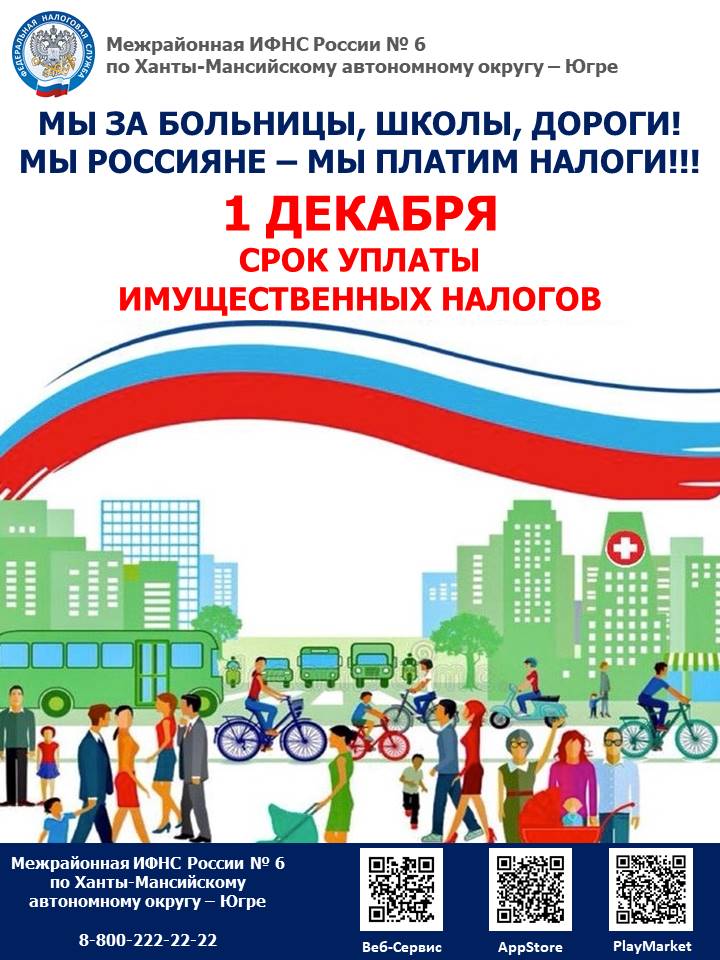 Межрайонная ИФНС России № 11 по ХМАО–Югре напоминает, что срок уплаты имущественных налогов за 2021 год истекает 1 декабря.Удобнее всего осуществить оплату в сервисе ФНС России «Личный кабинет налогоплательщика для физических лиц», а также его мобильной версии «Налоги ФЛ» (скачивание доступно в AppStore и GooglePlay).